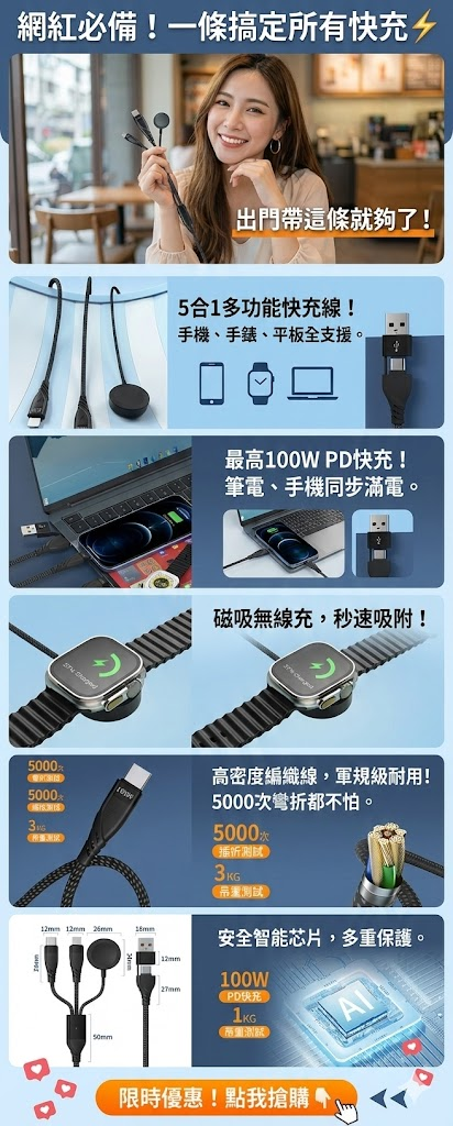 「自從換了這條 5合1,我現在出門包包變得超整潔!不管是在咖啡廳工作還是出國旅遊,一條線解決所有設備,朋友看到都跟著被推坑。這真的是目前看過最強大的『充電怪獸』,真心推薦每個 3C 控都要有一條!」