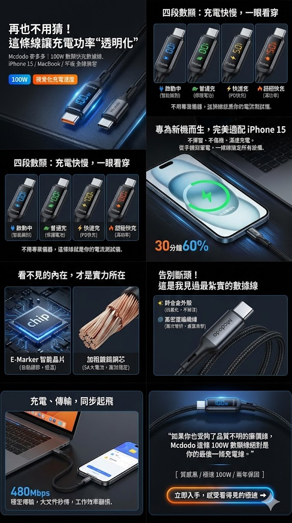 今天帶來這款 Mcdodo 麥多多 100W 數顯快充數據線 的開箱分享。它最大的特色就是把「充電功率透明化」,就像隨身帶著專業儀器,讓你親眼見證設備滿血復活的過程!