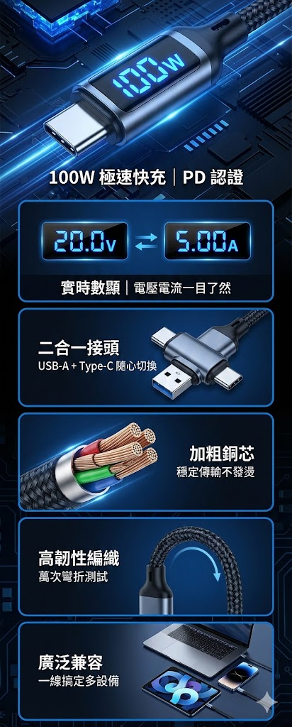 【極速黑科技】100W 智能數顯二合一快充線 | PD認證 Type-C/USB-A 自由切換 | 實時電壓電流監測 | 電競級編織耐用材質