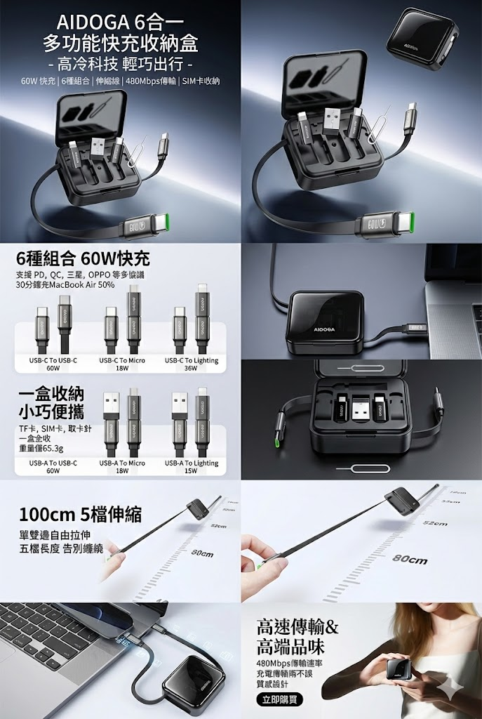 【AIDOGA】6合一多功能快充伸縮收納盒 | 高冷科技・輕巧出行