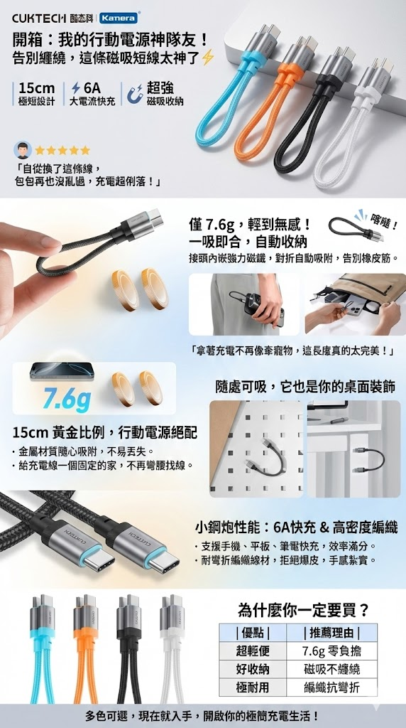 今天要來推坑一個讓我相見恨晚的各種「線材焦慮」終結者——由酷態科 CUKTECH 與 Kamera 聯手打造的 15cm 磁吸編織快充線。自從換了它,我的包包再也沒亂過,充電體驗簡直俐落到不行!