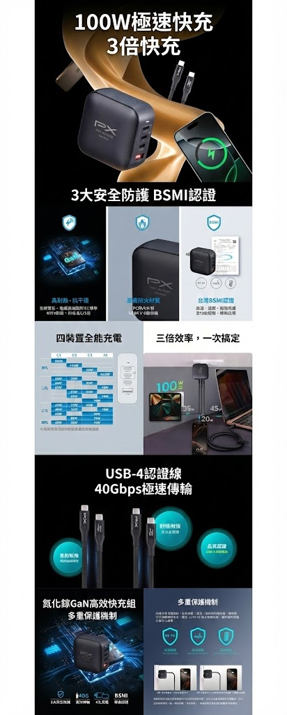 品名:PX大通 100W GaN氮化鎵高效快充組